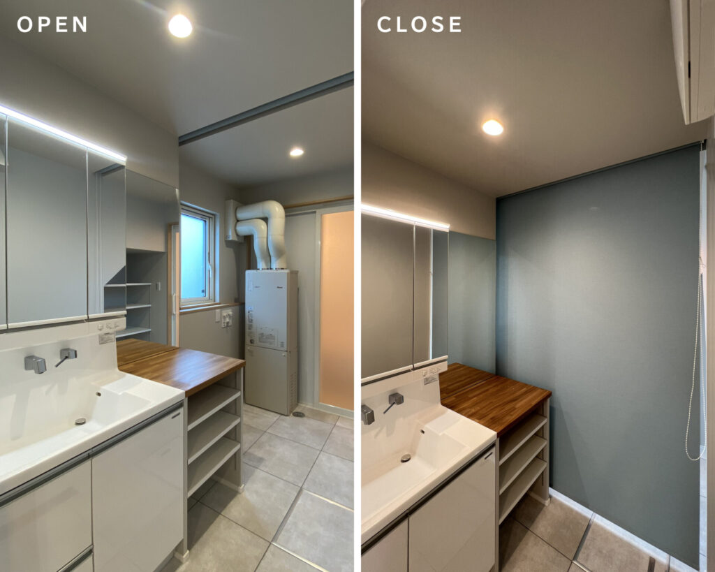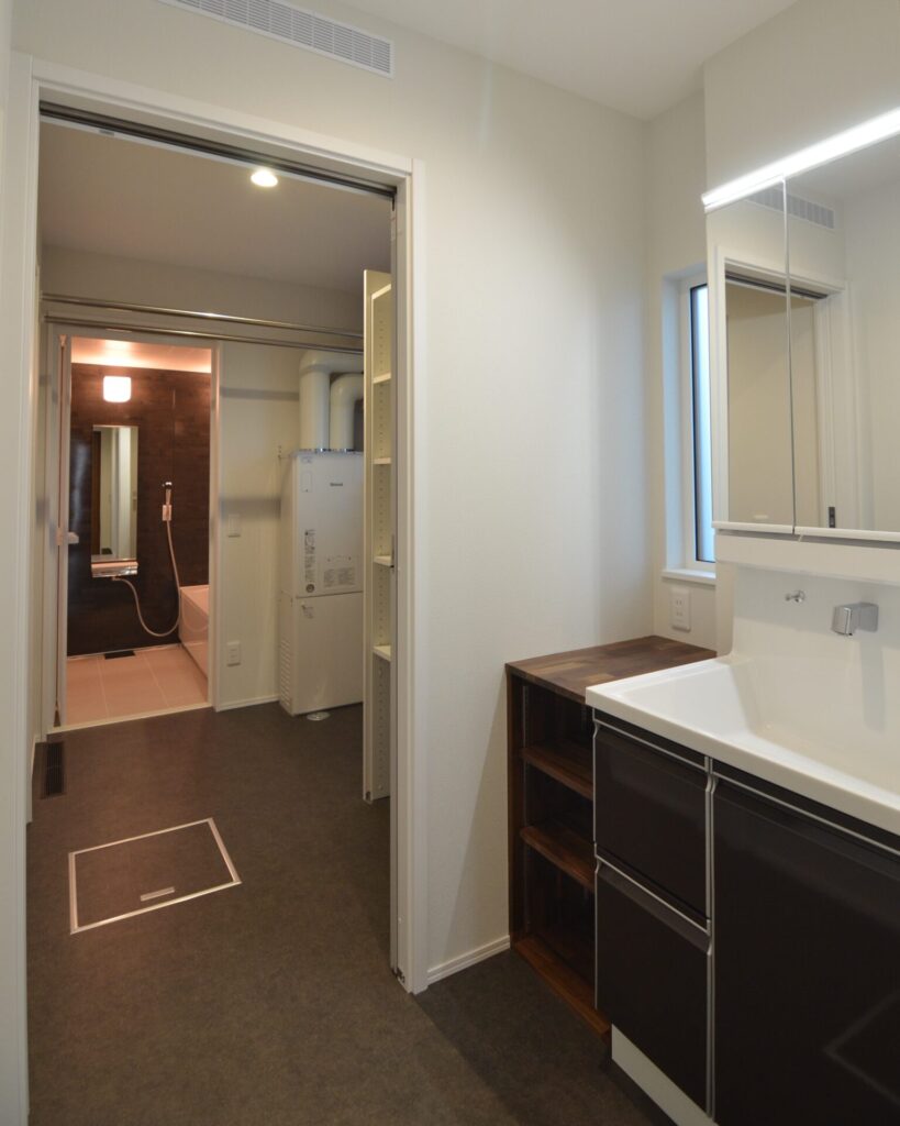 メリットは、脱衣室には脱いだ衣類と洗濯物などの生活感溢れる空間を隠せる点や、家族で、シャワーを浴びたい人、歯磨きをしたい人で時間が被ったときでも気にすることなく使用できる。